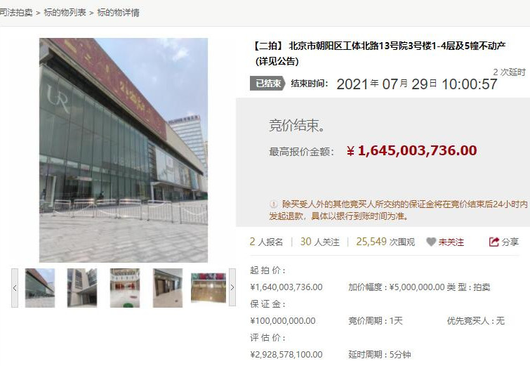 7月29日,北京产权交易所司法拍卖平台显示,当天上午10时,北京卓睿物业管理有限公司通过竞买号C7UZX在“北京市朝阳区工体北路13号院3号楼1-4层及5幢不动产(即世茂工三)”项目公开竞价中,以较高应价胜出,成交价格约为16.45亿元。