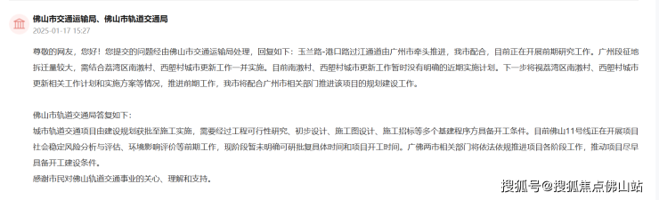 近日,有网民在领导留言板提问:“为改善三山新城交通配套,能否先推动港口路北延或佛山地铁11号线建设?”