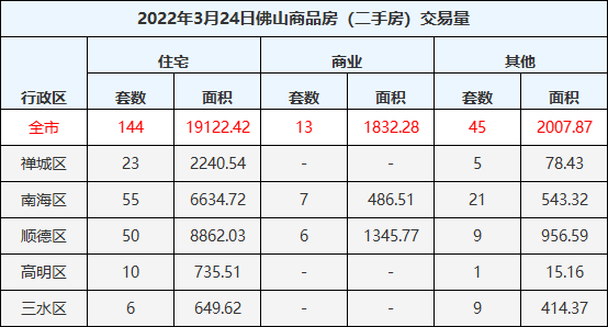 二手住宅成交144套,成交面积19122.42㎡,禅城23套,南海区55套,顺德区50套,高明区10套,三水区6套。