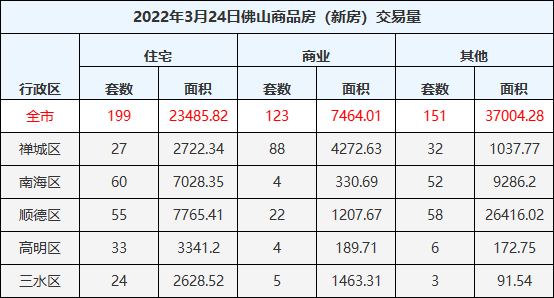 3月24日,佛山一手住宅成交199套,成交面积23485.82㎡