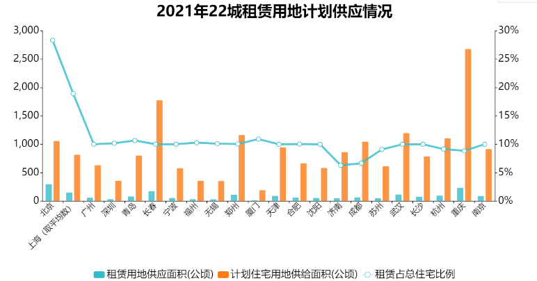 此外,今年实施的22城“双集中”供地新政明确要求,在年度计划中单列租赁住房用地的占比一般不低于10%。总体来看,22城披露的2021年住宅用地计划总供应19546.05公顷,租赁用地计划总供应2119.53公顷,占比达10.84%。