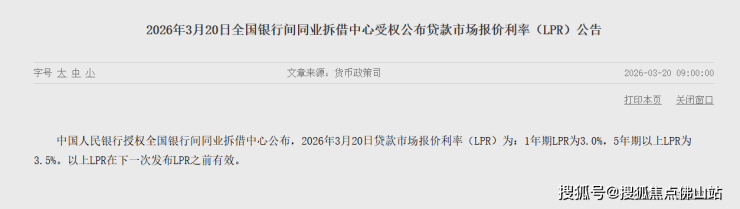 中国人民银行授权全国银行间同业拆借中心公布,2026年3月20日贷款市场报价利率(LPR)为:1年期LPR为3.0%,5年期以上LPR为3.5%。以上LPR在下一次发布LPR之前有效。