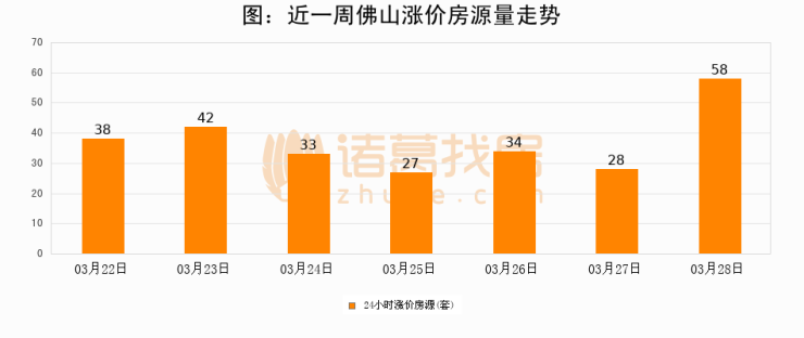 根据诸葛找房数据显示,佛山24小时涨价房源量为58套,较03月27日增加30套,环比上涨107.1%。与此同时,涨价房源占比小幅扩大,业主信心有所提升。