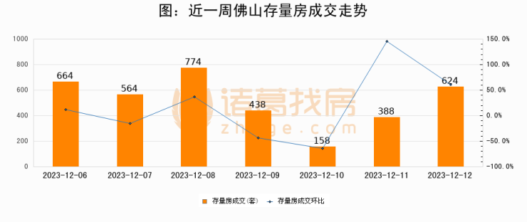 从存量房来看,2023年12月12日佛山存量房单日成交624套,比昨日增加236套,环比上涨60.8%。从近一周存量房成交来看,佛山存量房日均成交套数为515套,12月12日单日成交624套,高于近一周平均水平21.2%。