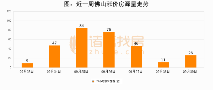 根据诸葛找房数据显示,佛山24小时涨价房源量为26套,较09月28日增加15套,环比上涨136.4%。与此同时,涨价房源占比小幅扩大,业主信心有所提升。