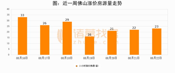 根据诸葛找房数据显示,佛山24小时涨价房源量为23套,较08月21日增加1套,环比上涨4.5%。与此同时,涨价房源占比小幅扩大,业主信心有所提升。