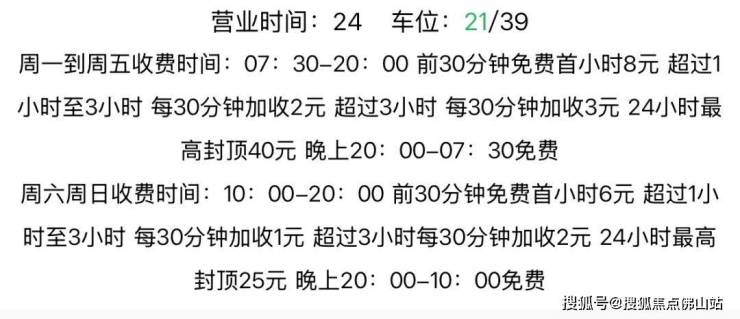 收费标价牌显示,周一至周五白天首小时每辆车8元,3小时内按2元/半小时、超过3小时按3元/半小时,夜间免费,全天最高限价40元。
