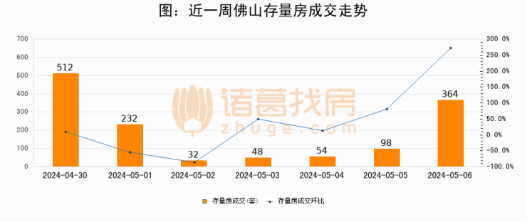 从存量房来看,2024年05月06日佛山存量房单日成交364套,比昨日增加266套,环比上涨271.4%。从近一周存量房成交来看,佛山存量房日均成交套数为191套,05月06日单日成交364套,高于近一周平均水平90.6%。