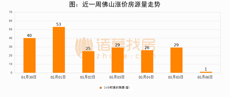 根据诸葛找房数据显示,佛山24小时涨价房源量为1套,较05月05日减少28套,环比下降96.6%。与此同时,涨价房源占比小幅回落,对于购房者来说是一个入市窗口期,购房者可抓住时机入市。