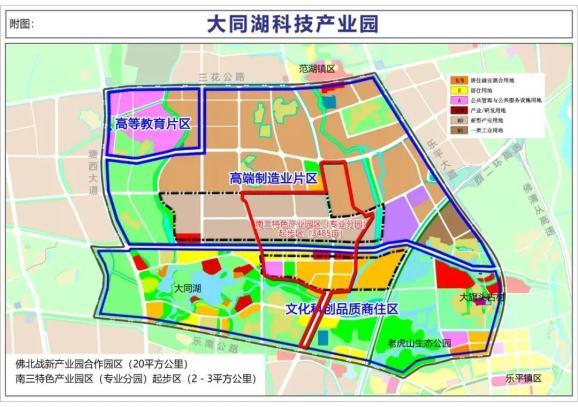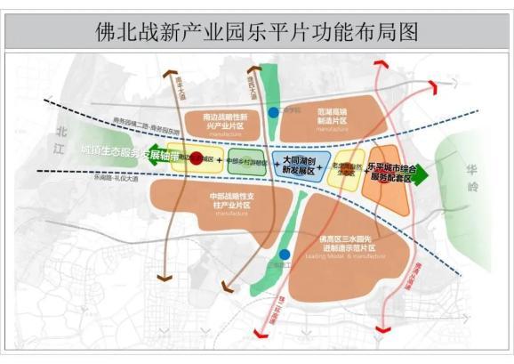 三水乐平在佛北战新产业园(乐平片)概念性规划方案基础上,结合国土空间总体规划“三区三线”划定,进一步优化国土空间、基础设施等规划,制定控制性详细规划,精细化空间布局,加强地下综合管廊和地上路网规划的整体性、系统性,前瞻布局产业园信息化基础设施。在发展格局上,发挥大同湖核心联结作用,以北打造创新科技研发孵化区,以南打造设施完善、环境优良的高端生产生活配套区,在中部形成城镇生态服务发展轴带,轴带南北两侧分别布局高端制造、战略性新兴产业、战略性支柱产业等功能区,形成“两核一带四片”的整体空间布局。