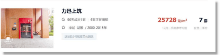 其中力讯上筑 参考均价约2.6万/㎡,挂牌总价在299-650万 之间,楼龄约10年。