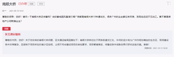 10月13日,顺德区交通运输局回复称,南顺大桥项目暂缓推进,待建设条件成熟后再行研究实施方案。