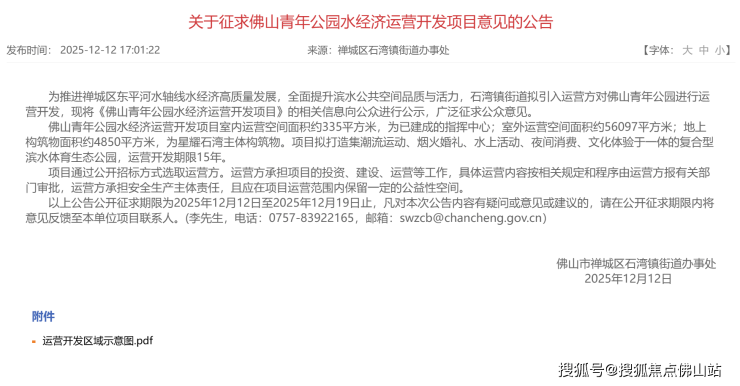 近日,禅城区石湾镇街道办事处发布关于征求佛山青年公园水经济运营开发项目意见的公告。