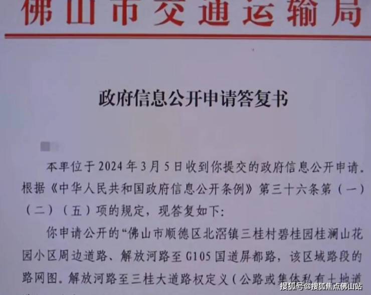 该业主向佛山市交通运输局提交政府信息公开申请,而“政府信息公开申请答复书”中明确显示“三桂大道”为公路。