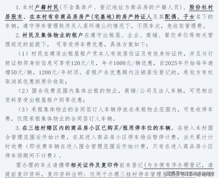 其中三桂村户籍村民不限车次,免收取管理费;村民自建房出租屋租户可享受120元/月,年卡1000元/辆的优惠;承租集体物业的合同签订人车辆停放在承租物业范围内,可免收停车费等。
