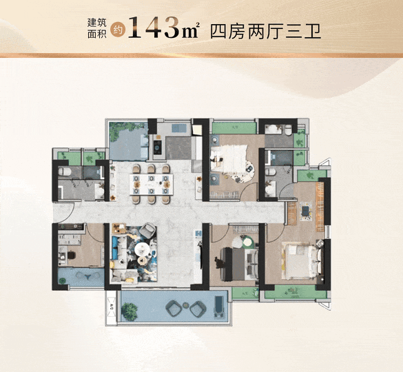 以建面约143㎡户型为例,为市面少有的正南双套房设计。